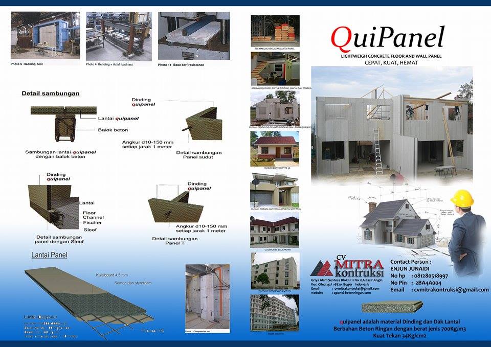 5.Kuat Berbeda dengan bata merah maupun bata ringan yang hanya memiliki kuat tekan saja, sedangkan kuat lenturnya ada pada kolom-kolomnya, dinding quipanel disamping mempunyai kuat tekan juga mempunyai kuat lentur sehingga tidak memerlukan kolom praktis. Untuk lantai dak tebal 75mm dapat menahan beban 380kg/m2